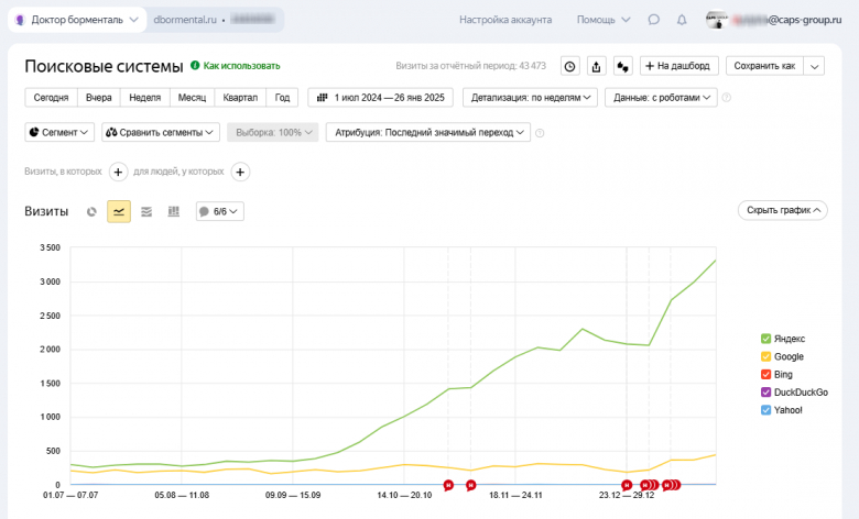 Наша компания CapsGROUP продвигая сайт клиента в поисковых системах Яндекскратно увеличила посещаемость сайта dbormental.ru, что привело к значительному росту количества заявок.